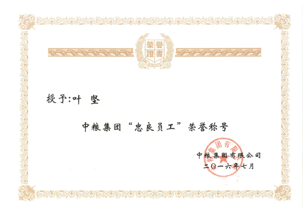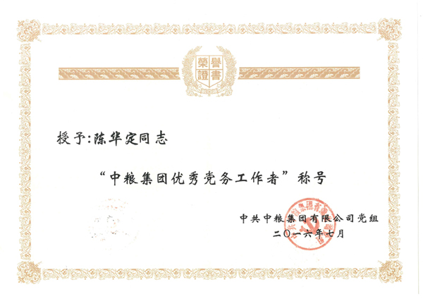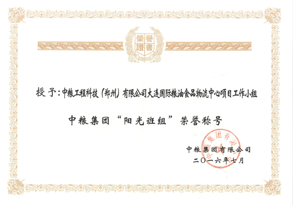 7月,在中糧集團黨組關于表彰優秀共產黨員、優秀黨務工作者和先進基層黨組織中,公司黨委書記、總經理陳華定被授予“中糧集團優秀黨務工作者”榮譽稱號。 在中糧集團開展“創建陽光班組,爭做忠良員工”活動中,中糧工程科技(鄭州)有限公司大連國際糧油食品物流中心項目工作小組被評為“中糧集團2014-2015年度陽光班組”;副總工程師葉堅被評為“中糧集團2014-2015年度忠良員工”。